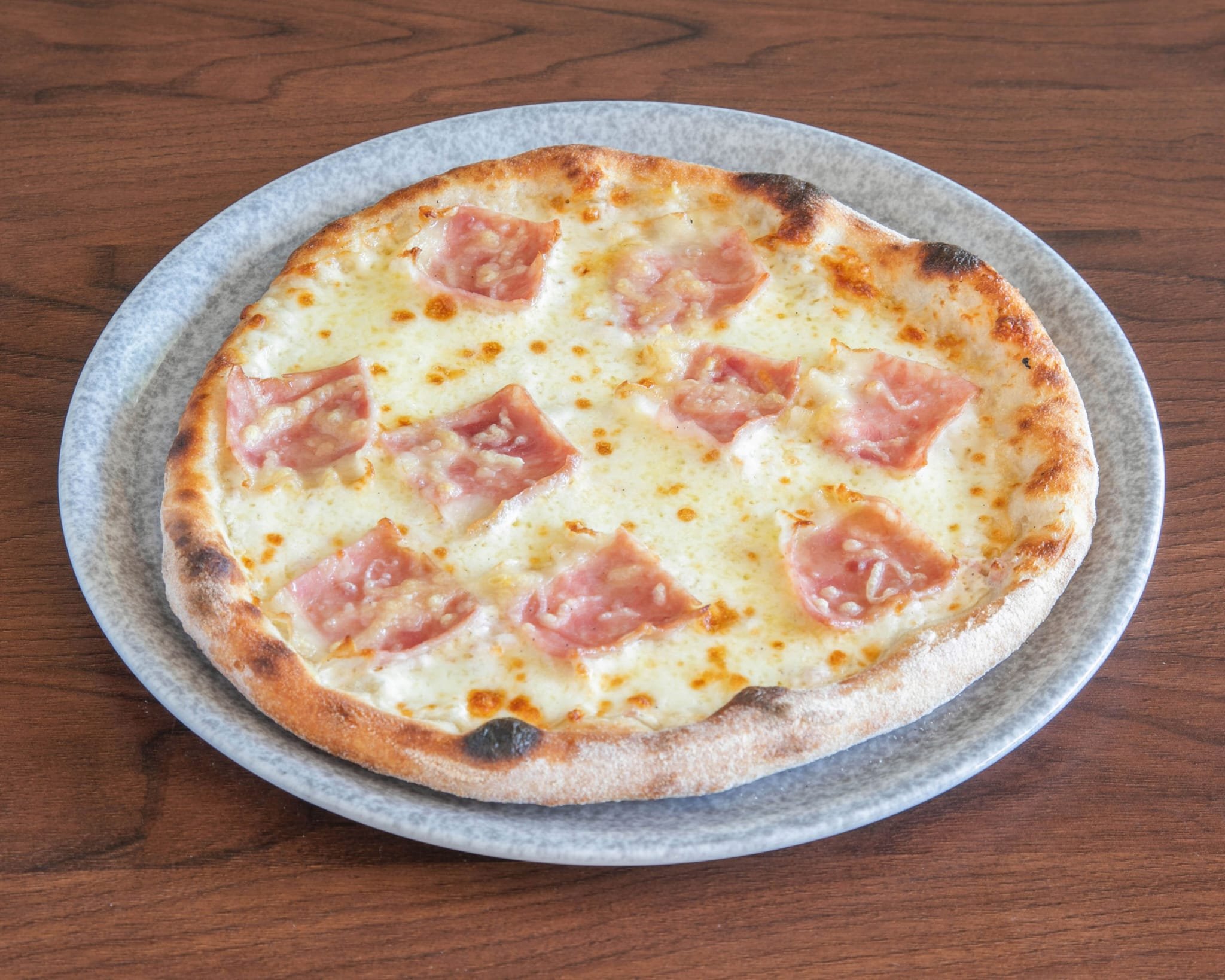 Mozzarella, salsa carbonara, bacón, emmental, cebolla y orégano